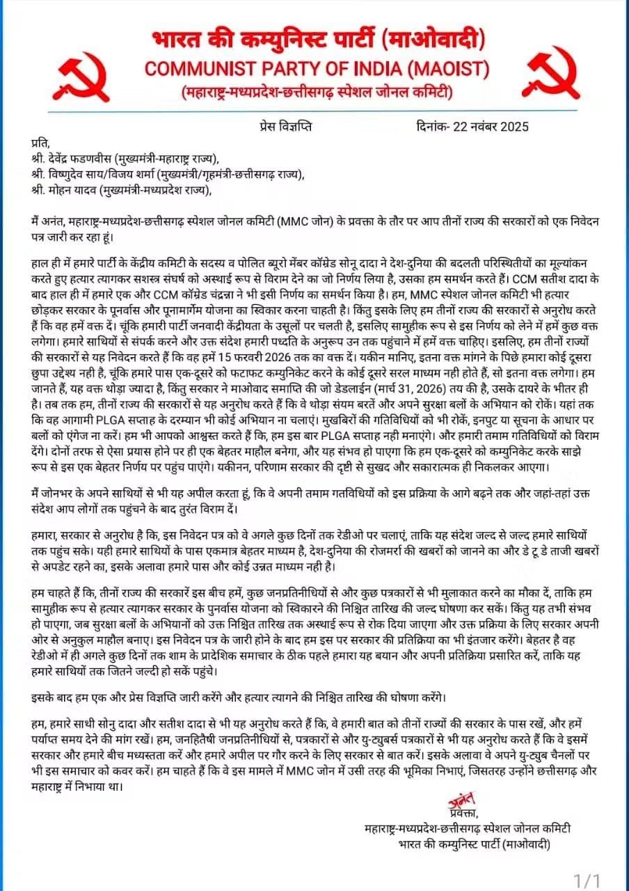 जगदलपुर: प्रतिबंधित संगठन भारतीय कम्युनिस्ट पार्टी (माओवादी) की महाराष्ट्र-मध्यप्रदेश-छत्तीसगढ़ विशेष जोनल कमेटी (एमएमसी जोन) ने 22 नवंबर को एक विज्ञप्ति जारी की है। जिसमें तीनों राज्यों की सरकारों से अस्थायी संघर्ष विराम का अनुरोध किया है। संगठन ने आत्मसमर्पण और पुनर्वास योजना पर सामूहिक फैसला लेने के लिए 15 फरवरी 2026 तक का समय मांगा है।