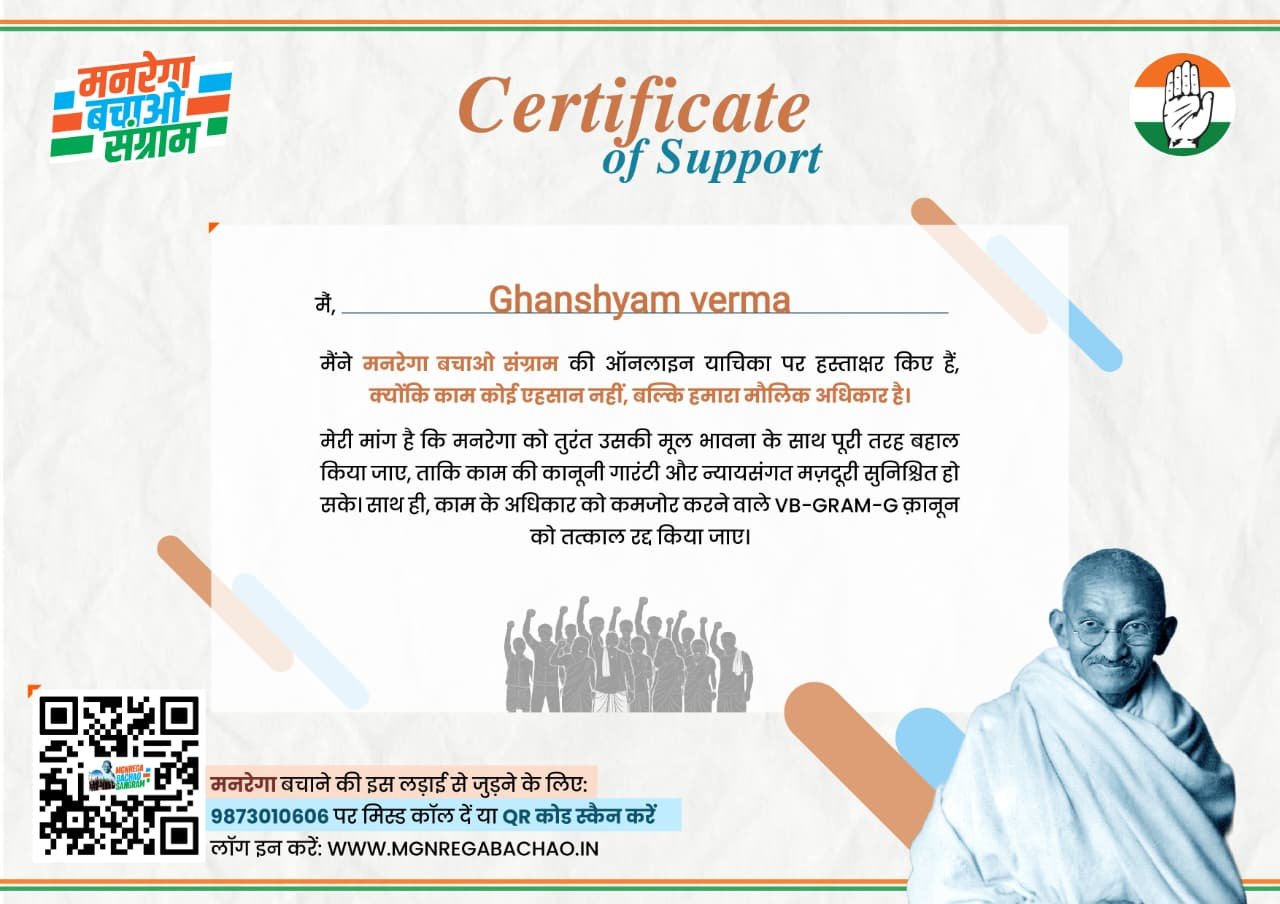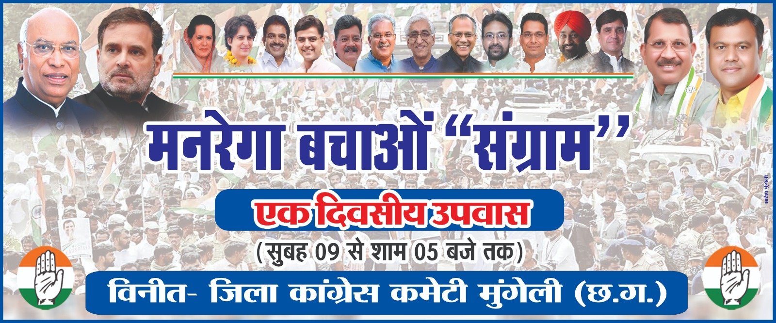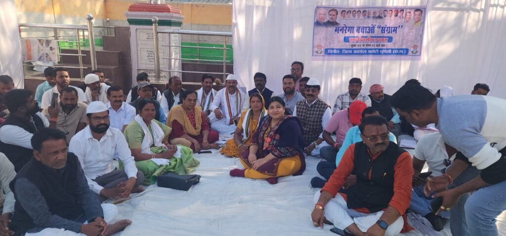 इसी कडी में पुराना बस स्टैण्ड में जिला कांग्रेस कमेटी के अध्यक्ष घनश्याम वर्मा एवं कार्यक्रम प्रभारी डॉ. प्रेमचंद जायसी के नेतृत्व में 1 दिन का उपवास रखकर विरोध प्रर्दशन किया गया । इस दौरान जिलाध्यक्ष ने कहा कि मोदी सरकार ने मनरेगा की मूल आत्मा को ही खत्म करके श्रमिकों से काम का अधिकार छीना है मनरेगा कानून में परिवर्तन मोदी सरकार का श्रमिक विरोधी कदम है। 100 दिन से 125 दिन की मजदूरी वाली बात सिर्फ एक चालाकी है, वर्तमान में छत्तीसगढ़ के 70 प्रतिशत गांव में भाजपा की सरकार आने के बाद से अघोषित तौर पर काम नहीं दिया जा रहा है। पिछले 11 सालों में मोदी सरकार बनने के बाद मनरेगा में काम देने का राष्ट्रीय औसत मात्र 38 दिनों का है। मतलब 11 सालो में मोदी सरकार किसी भी साल 100 दिन काम नहीं दे पाई। मनरेगा काम करने का सही अधिकार था, उसे अब एक एडमिनिस्ट्रेटिव मदद में बदला जा रहा है, जो पूरी तरह से केंद्र की मर्जी पर निर्भर है। मजदूरों के अधिकारों को सीमित करने वाला निर्णय है।